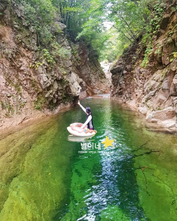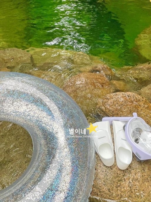 누가 계곡에 물감을 풀었나 싶을 정도로 색감이 정말 예쁘고, 청량함 한가득인 계곡 수영장입니다. 물고기가 보이는 투명함이 최고였으며 여기는 완전 신선놀음 끝판왕인 국내 힐링 여행지 베스트 10 입니다.